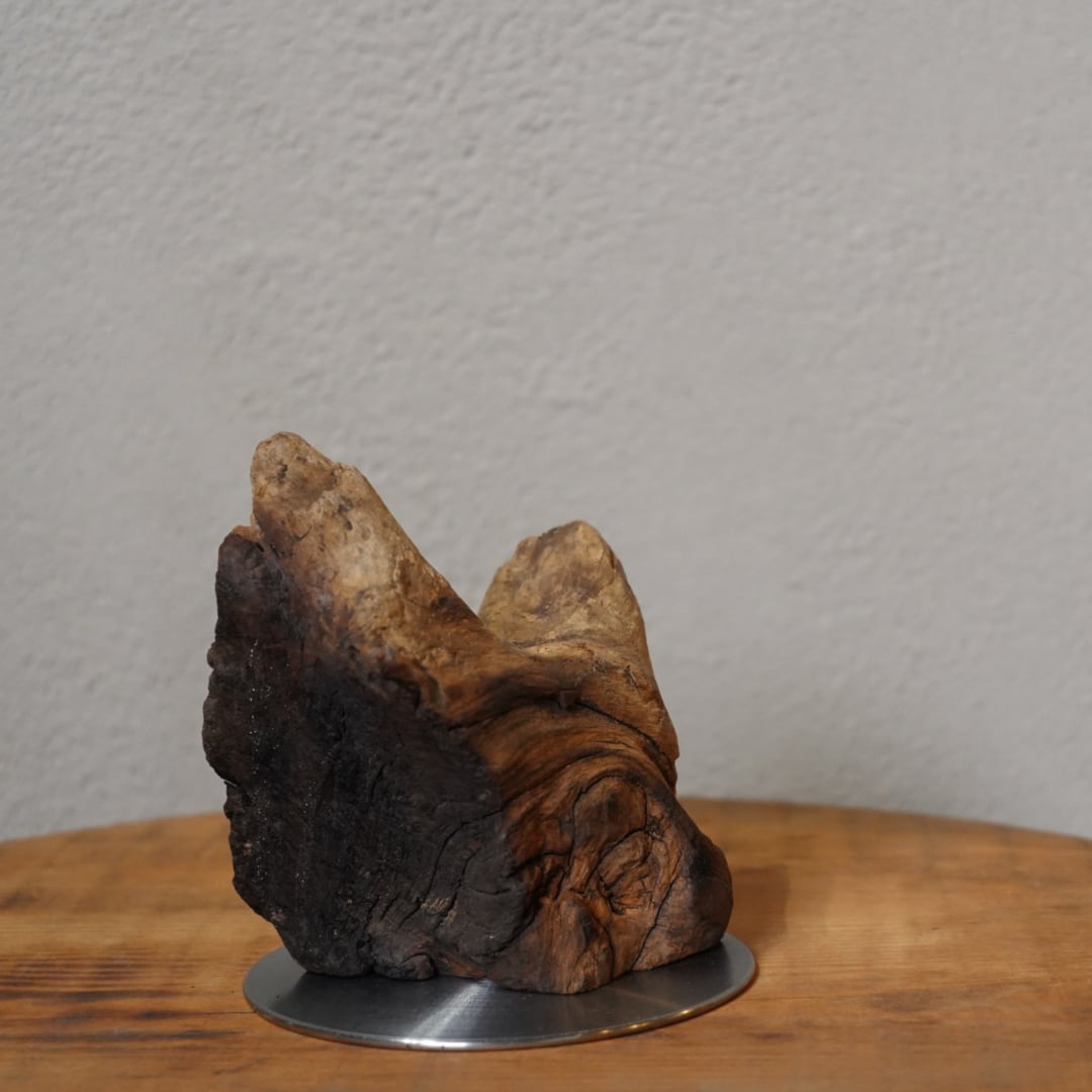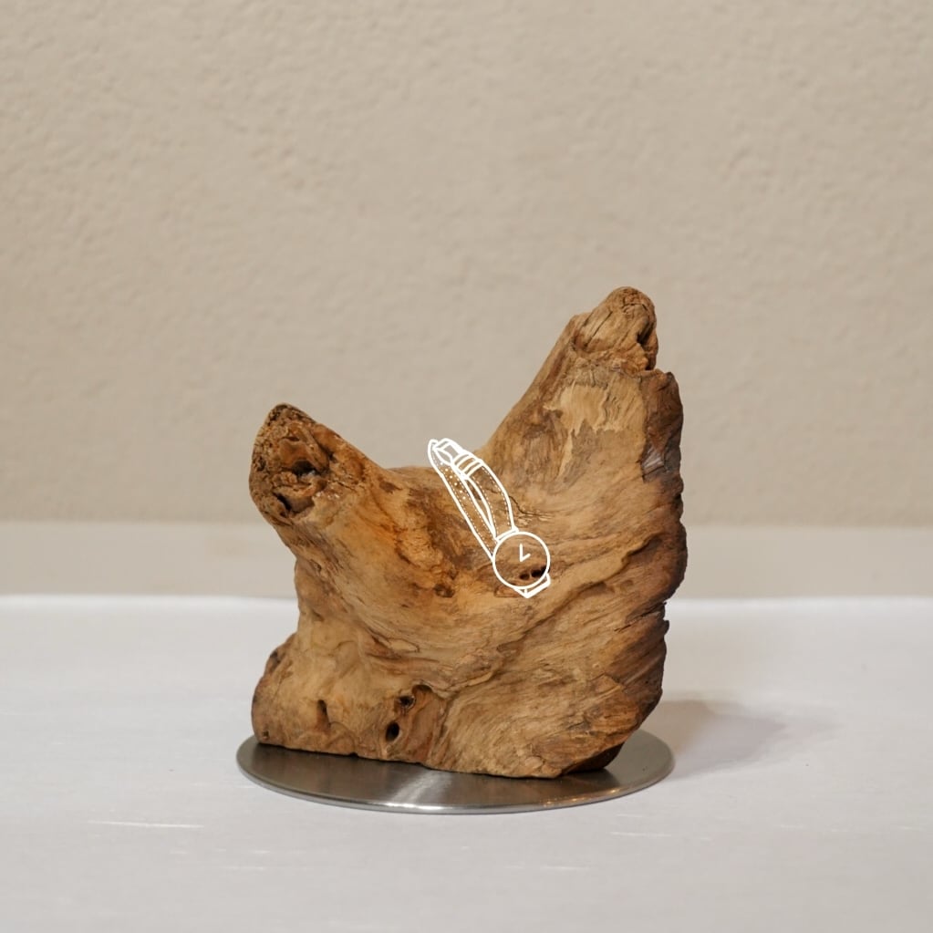 海と風が長い歳月をかけて削り出した流木の枝ぶりは、誰にも模倣できない自然の彫刻です。この一点ものの個性を、中心へ向かって幾重にも重なる「ラウンドヘアライン(波紋仕上げ)」の台座が、神聖な主役として定義します。
