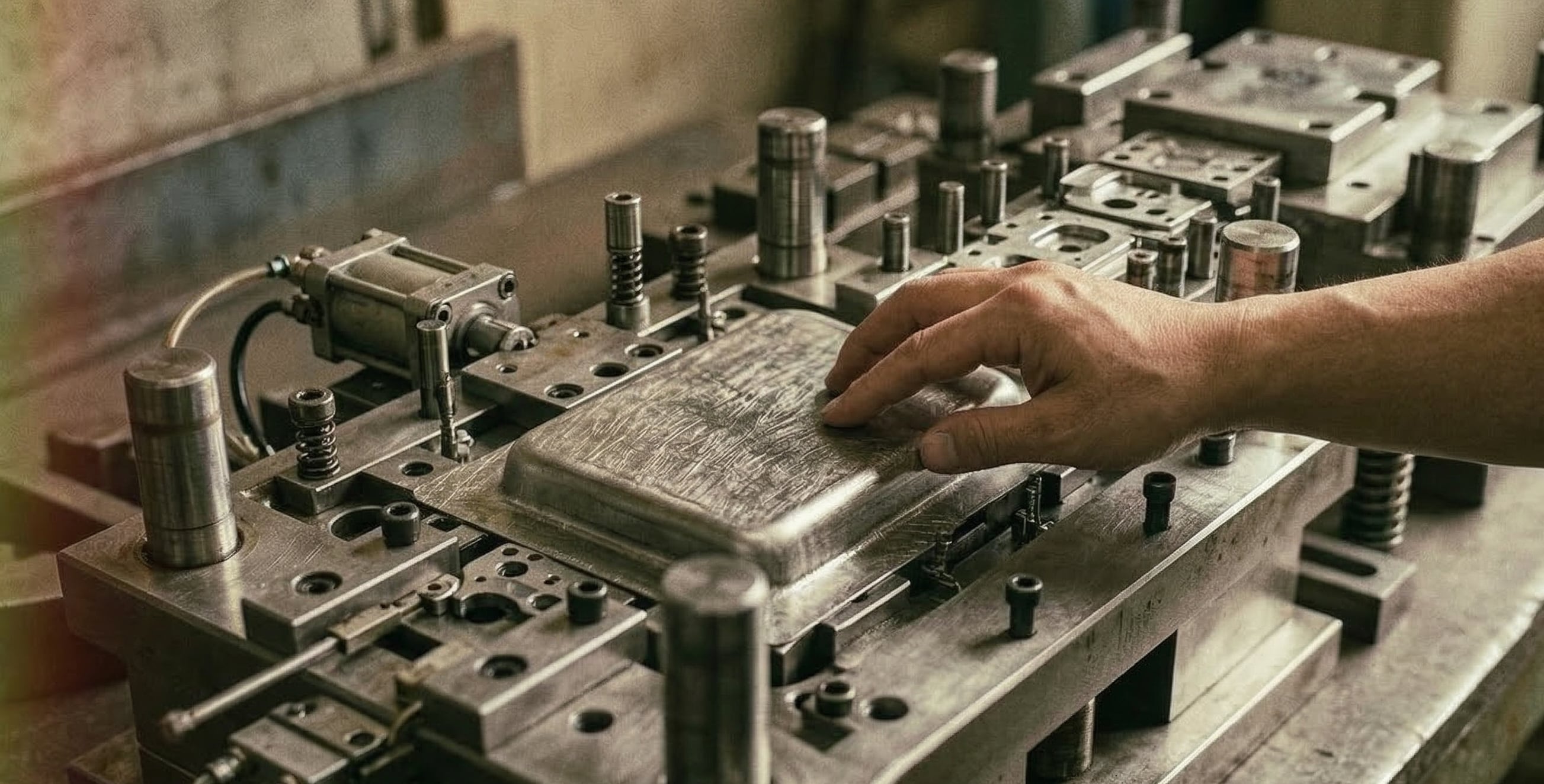 プレス金型は凸型と凹型で材料を打ち抜き、曲げ、絞りなど様々な加工を施します。